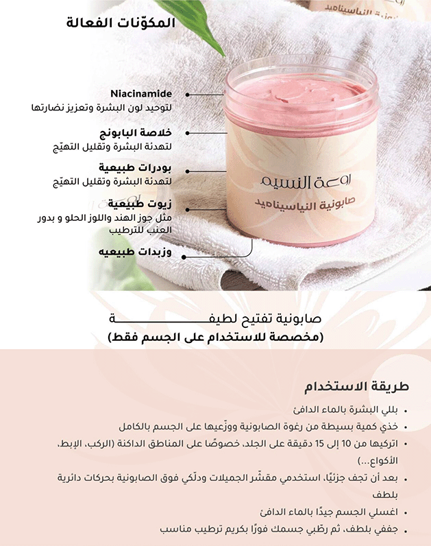 📌 لنتائج أفضل: يفضّل استخدام الصابونية مع مقشر الجميلات المتوفر في الموقع، 2–3 مرات بالأسبوع ولا تنسي ترطيب جسمك مباشرة بعد الاستحمام